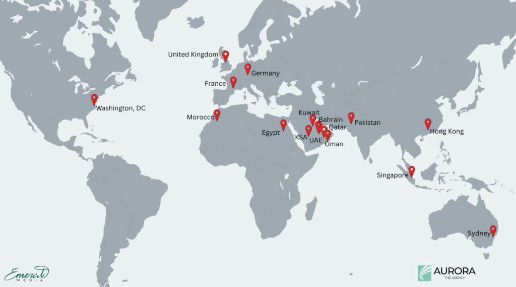 Through our network across the GCC and beyond, we deliver integrated PR, communications, and marketing support across the UAE, KSA, Qatar, Bahrain, Kuwait, Oman, Egypt, Morocco, and Pakistan.